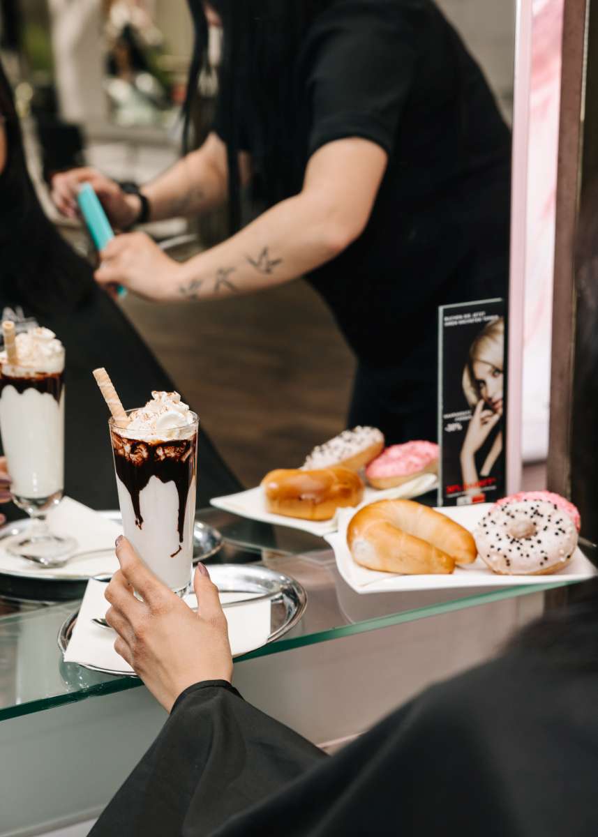 Unser Friseurcafé ist die perfekte Ergänzung zum Haarstudio: Vor, während oder nach deinem Termin laden wir dich ein, in gemütlicher Atmosphäre zu verweilen. Getränke aus der Café-Bar servieren wir dir selbstverständlich auch kostenlos direkt an deinen Platz im Salon.